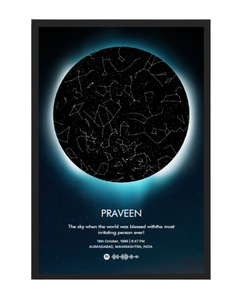 Personalize colors, text, constellations, and frame options.